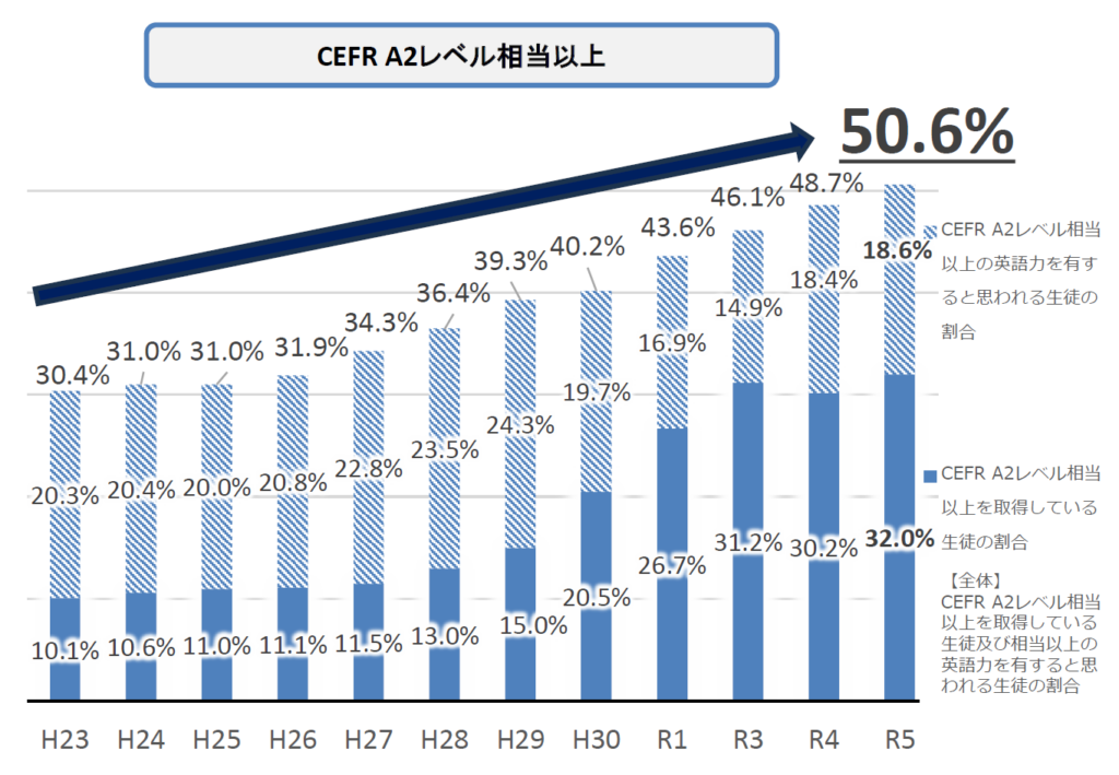 近年、日本の英語教育は着実に変化しています。文部科学省が公表している「令和5年度 英語教育実施状況調査」によると、高校3年生でCEFR A2レベル相当以上の英語力を有する生徒の割合は、50.6%に達しました。