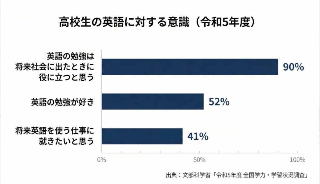 文部科学省「令和5年度 全国学力・学習状況調査」によると、高校生の約90%が「英語の勉強は将来役に立つ」と回答しています。一方で、「英語の勉強が好き」は約52%、「将来英語を使う仕事に就きたい」は約41%にとどまっています。